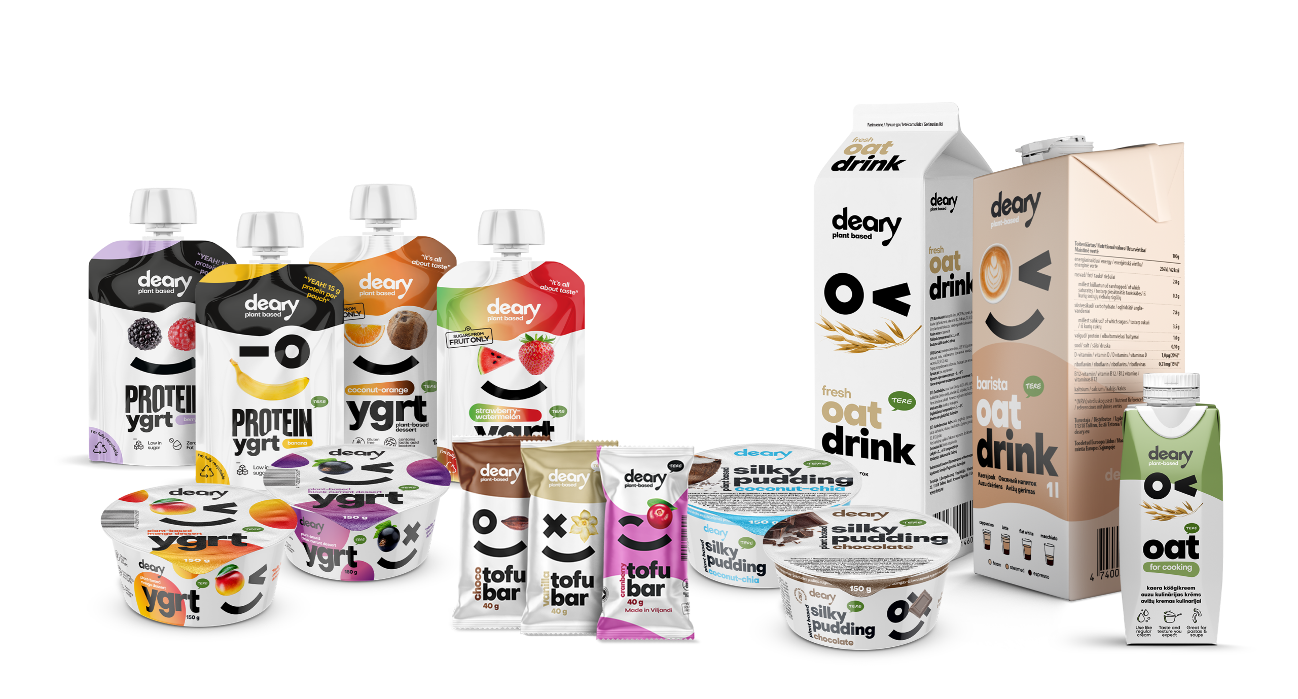 meet the family Glazed tofu bar with vanilla Glazed tofu chocolate bar Tofu bar with cranberry filling in chocolate coating Strawberry-watermelon plant-based dessert Coconut-orange plant-based dessert Coconut-chia pudding Plant-based berry dessert with sugar and sweetener Plant-based banana dessert with sugar and sweetener Mango ygrt Black currant ygrt Barista oat drink Oat for cooking Fresh oat drink Silky chocolate pudding